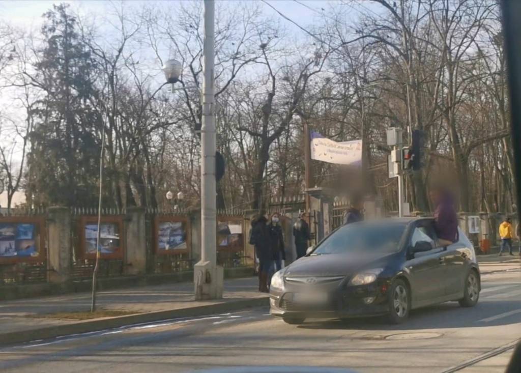 În Iași, o mașină cu tineri a fost surprinsă în trafic în timp ce pasagerii din spate se instalaseră pe geam.