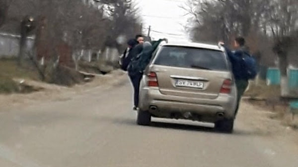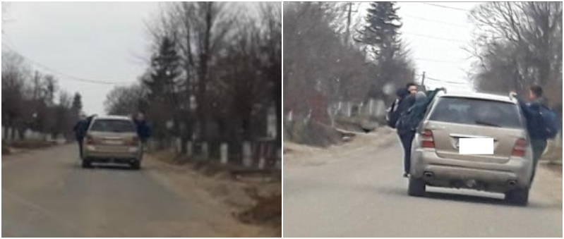 O șoferiță a pus pe jar Poliția după ce au apărut imagini care arată că a transportat cu mașina patru copii agățați de barele metalice ale caroseriei. Incidentul s-a petrecut într-o localitate din județul Suceava. Șoferița, în vârstă de 20 de ani, a fost identificată și amendată.