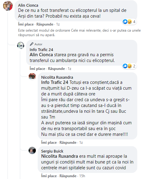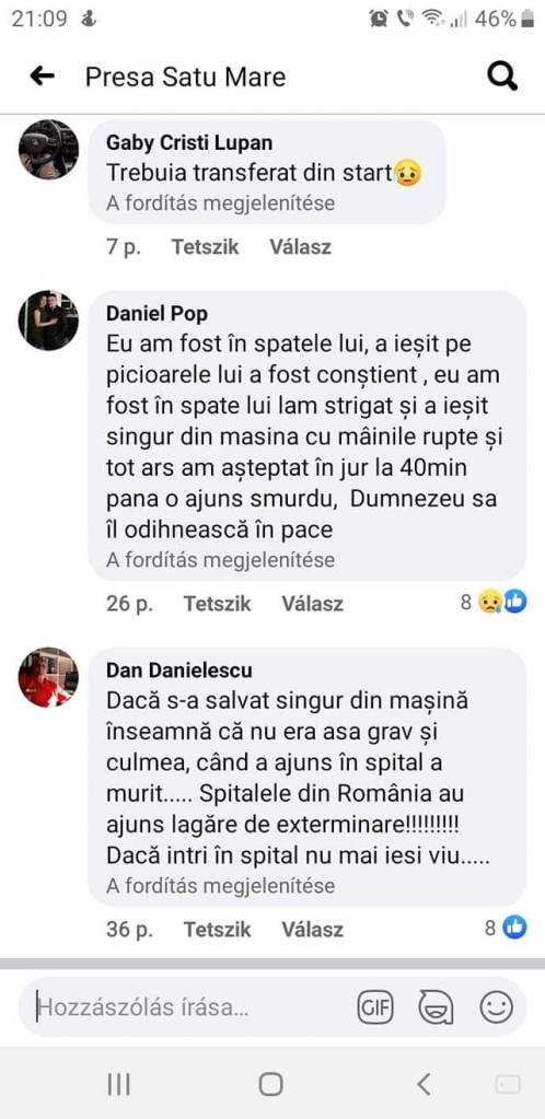 Potrivit site-ului local presasm.ro. tânărul, care se afla singur în vehicul, s-a autoevacuat din mașina care s-a aprins în urma impactului, dar s-a ales cu mai multe arsuri, pe o suprafață de 55% din corp, în special la nivelul toracelui și ale căilor respiratorii superioare. Acesta a fost transportat la Unitatea de Primire Urgențe Satu Mare. Nu a mai putut fi salvat. Decesul tânărului a stârnit revoltă printre internauți, probabil cunoștințe ale acestuia. De ce nu a fost băiatul transferat din start?, se întreabă un internaut. Altul spune că ambulanța a ajuns după circa 40 de minute la locul accidentului. (vezi mesajele mai jos)