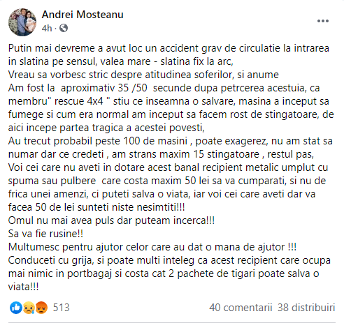 Un martor ocular a povestit pe grupul de Facebook Info Trafic Slatina că a încercat să stingă flăcările, iar din zecile de autoturisme care au oprit în zonă a reușit să adune doar 15 stingătoare (mesajul, mai jos).