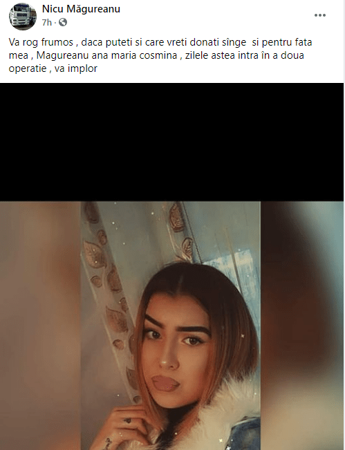 „Va rog frumos , daca puteti si care vreti donati sînge si pentru fata mea , Magureanu ana maria cosmina , zilele astea intra în a doua operatie , va implor„