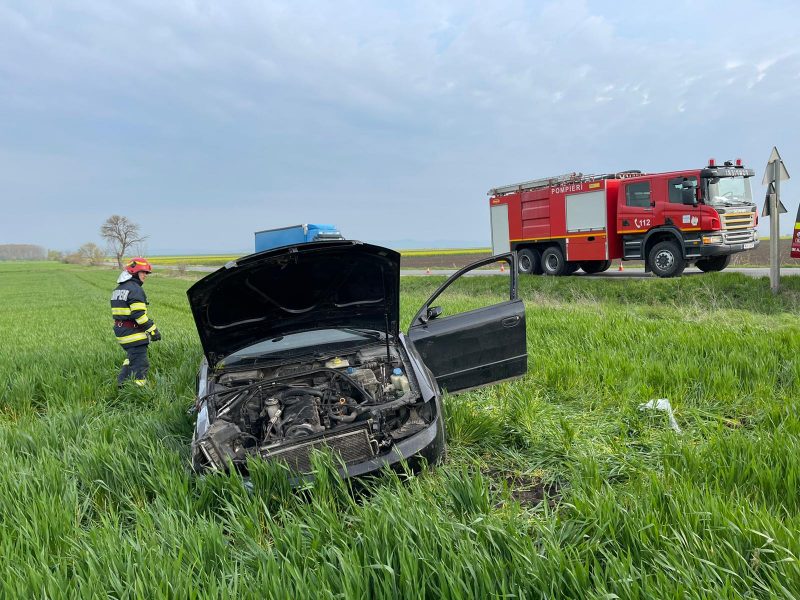 Mașina s-a răsturnat în afara drumului, pe câmp.