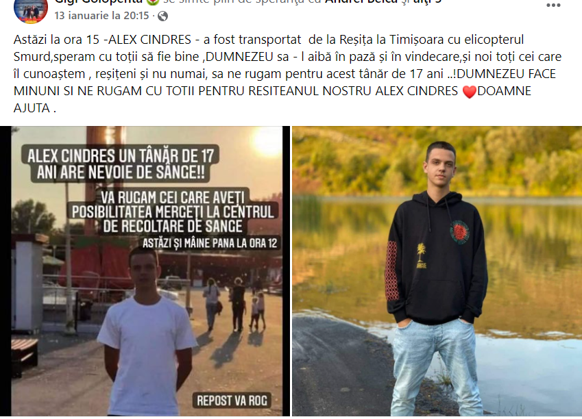 Un tânăr de 22 de ani, pasager, a decedat la scurt timp după ce mașina în care se afla, condusă de un alt tânăr de 22 de ani a intrat într-un stâlp pe un pod din Reșița, doborându-l. Trei zile mai târziu a decedat la spital și șoferul de 22 de ani (foto 2, mai jos). Pe 31 ianuarie s-a stins din viață, la spital, încă un tânăr de 17 ani, Alex Cîndreș, pasager în autoturism (foto 3, mai jos). Apropiații făcuseră apel la donarea de sânge pentru a salva viața adolescentului. Singurul supraviețuitor este un bărbat de 26 de ani.