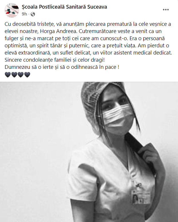 Tânăra decedată se pregătea să devină asistent medical. Studia la Școala Postliceală Sanitară Suceava, care a transmis un mesaj de regret: