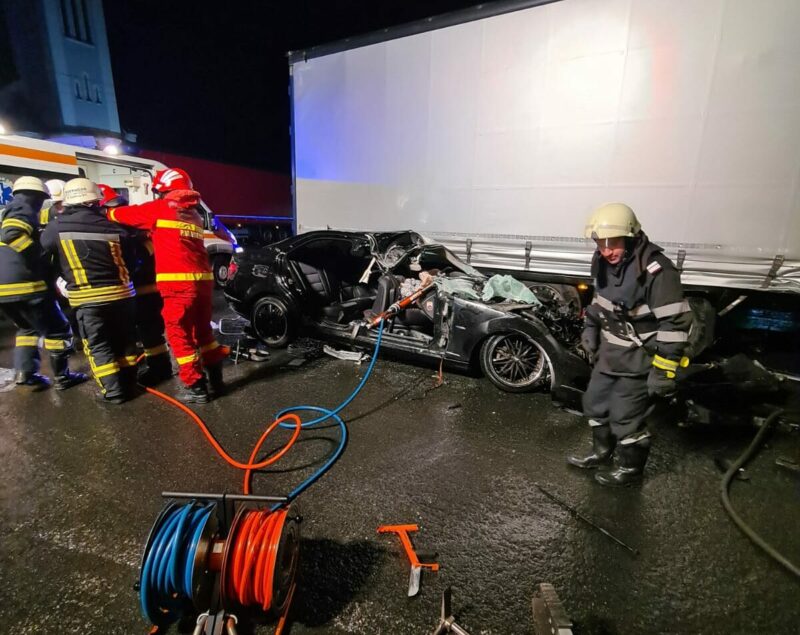 În urma impactului cu TIR-ul, persoanele din mașină au rămas încarcerate.