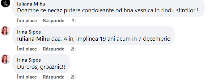 Tânărul era singur în maşină. Cunoscuții au transmis zeci de mesaje de regrete pe rețeaua Facebook, unul dintre ei dezvăluind că Alin ar fi împlinit 19 ani în decembrie.